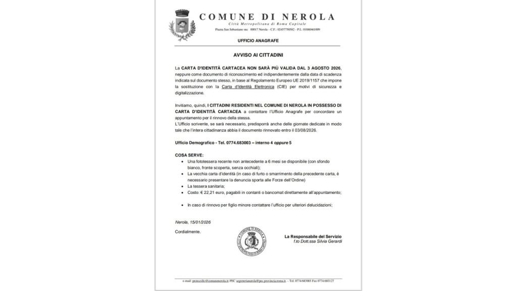 Il Comune di Nerola informa la cittadinanza che a partire dal 3 agosto 2026 la carta d’identità cartacea non sarà...