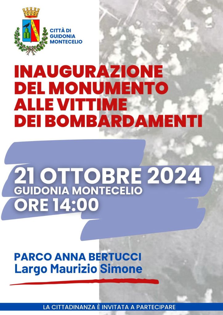 In occasione dell’87° anniversario dell’istituzione del Comune di Guidonia Montecelio, l’Amministrazione comunale intende ricordare e valorizzare la storia della Città. Lunedì 21 ottobre 2024, alle ore 14:00, presso il parco Anna Bertucci, si terrà l’inaugurazione del monumento dedicato alle vittime dei bombardamenti. Un momento significativo per la comunità, che sarà chiamata a riflettere su uno degli eventi più drammatici del nostro passato, ricordando chi perse la vita nei tragici bombardamenti.