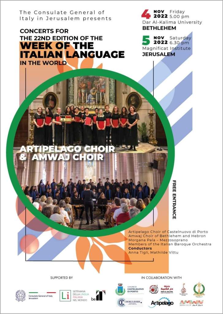 Con una performance di più stili musicali intitolata ‘Artipelago and Amwaj: Twin choirs, Italy and Palestine’ prende corpo lo scambio culturale tra Castelnuovo di Porto e Betlemme per celebrare la Settimana della Lingua Italiana nel Mondo.
