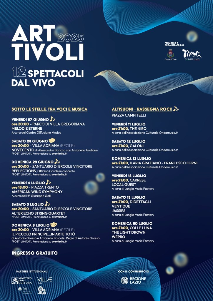 Dal 27 giugno al 20 luglio 2025, la città di Tivoli ospiterà ART TIVOLI, una rassegna culturale che porterà dodici spettacoli dal vivo in alcuni dei luoghi più suggestivi del territorio, tra cui Villa Gregoriana, Villa Adriana, il Santuario di Ercole Vincitore, Piazza Trento e Piazza Campitelli.
