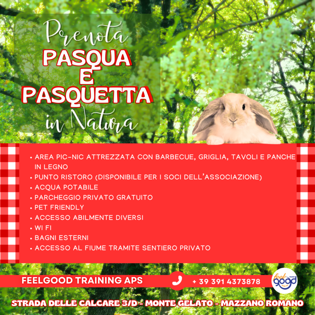 In occasione delle festività di Pasqua e Pasquetta, l’Associazione Internazionale FeelGood Training APS è felice di invitare tutti i Soci della Community, i loro amici e le famiglie a trascorrere una giornata speciale immersi nella natura incontaminata della Riserva Naturale del Parco del Treja. Una festa all’insegna del relax, della convivialità e del contatto con l’ambiente, che si svolgerà nella nostra splendida sede situata a due passi da Roma, tra Mazzano Romano e Calcata.
