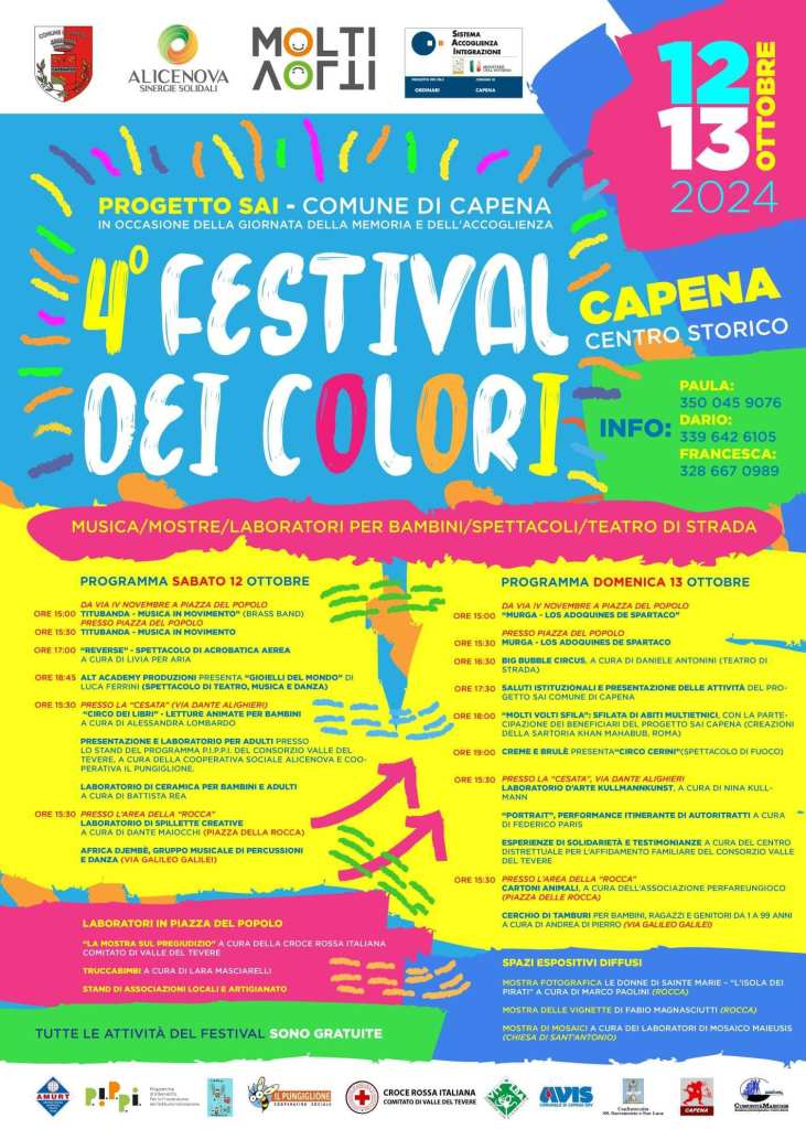 Il Festival dei Colori torna a Capena per un fine settimana ricco di eventi, previsto per sabato 12 e domenica 13 ottobre 2024. La manifestazione offrirà una varietà di attività artistiche, musicali e culturali per tutte le età, dislocate in diverse aree della città.