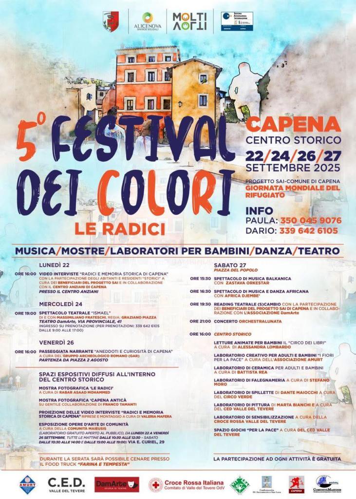 Dal 22 al 27 settembre 2025 il centro storico di Capena si è trasformato in un palcoscenico diffuso per ospitare la quinta edizione del Festival dei Colori, un’iniziativa promossa dal progetto SAI del Comune di Capena in occasione della Giornata Mondiale del Rifugiato. Il tema scelto, “Le radici”, ha ispirato una ricca programmazione culturale dedicata all’accoglienza, alla memoria e alla valorizzazione del territorio.