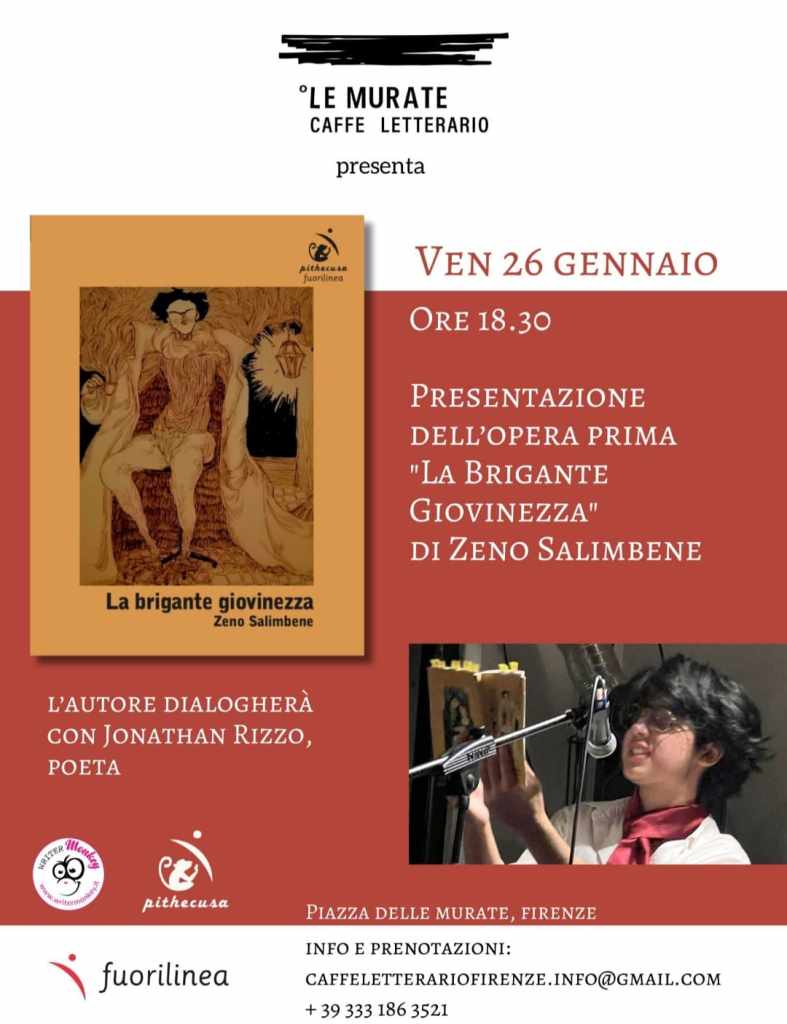 Venerdì 26 gennaio, gli amanti della letteratura avranno l’opportunità di immergersi in una serata culturale unica a Firenze. Presso il suggestivo Caffè Letterario Le Murate, situato in Piazza delle Murate, l’autore Zeno Salimbene presenterà con entusiasmo la sua ultima opera, “La brigante giovinezza“.