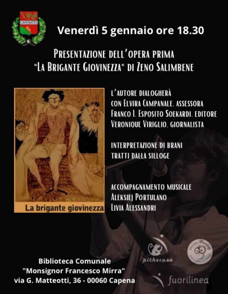 L’evento sarà impreziosito da momenti performativi tratti da “La Brigante Giovinezza”, l’opera di Salimbene. Ad accompagnare questi intermezzi, due talentuosi musicisti, Aleksiej Portulano e Livia Alessandri, giovani come lo stesso autore, regaleranno al pubblico la loro arte, già esibitasi con successo durante la prima presentazione del libro al Bohemian Art.