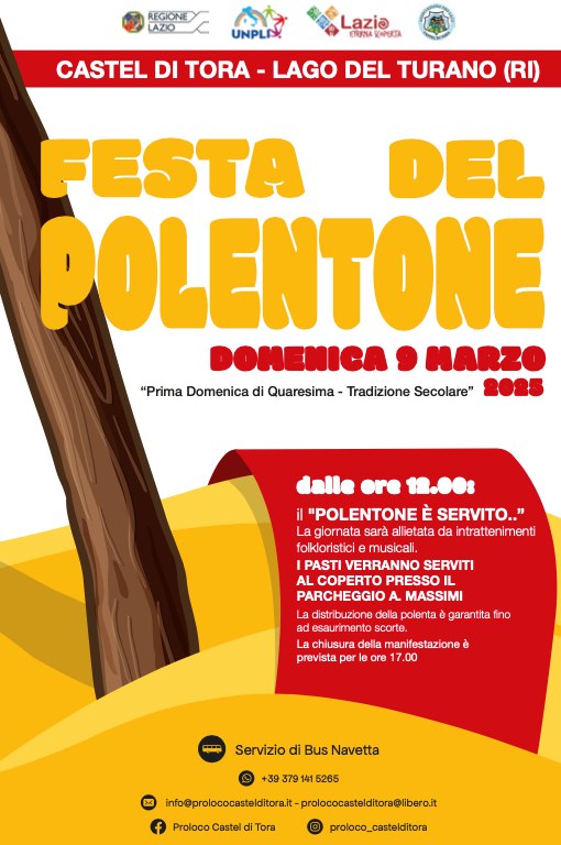 Domenica 9 marzo, Castel di Tora si trasforma nel paradiso dei buongustai con la Sagra del Polentone. Le abili mani delle donne castelvecchiesi, così vengono chiamati gli abitanti del borgo, prepareranno la famosa polenta, servita con un condimento unico e saporito: ragù di aringa, tonno, baccalà e alici, che racconta storie di tempi lontani e della tradizione quaresimale.