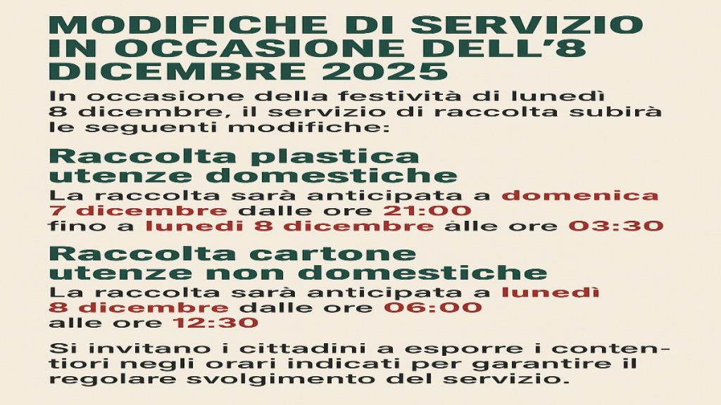 In occasione della festività di lunedì 8 dicembre, il Comune di Mentana ha comunicato alcune modifiche al servizio di raccolta...