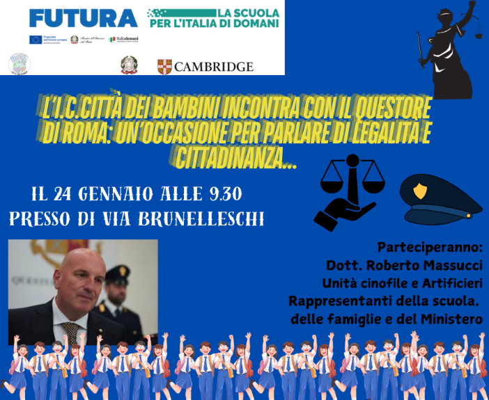 Il 24 gennaio, a partire dalle ore 9.30, i ragazzi e le ragazze della scuola primaria e secondaria dell’I.C. “Città dei Bambini” vivranno una giornata speciale dedicata alla legalità e alla cittadinanza. Gli studenti avranno infatti l’opportunità di incontrare il nuovo questore di Roma, Dott. Roberto Massucci, in un evento che si preannuncia ricco di contenuti formativi e di grande valore educativo.
