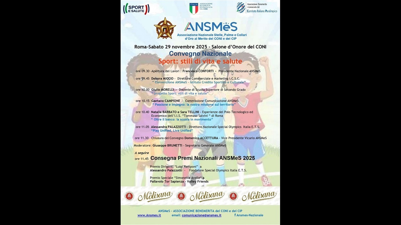 Il convegno è promosso dall’ANSMeS in collaborazione con CONI, Comitato Paralimpico Italiano e Sport e Salute, con il supporto de La Molisana come official sponsor. L’iniziativa conferma una rete di cooperazione tra sport, scuola e istituzioni che punta a diffondere una cultura del benessere accessibile e condivisa.