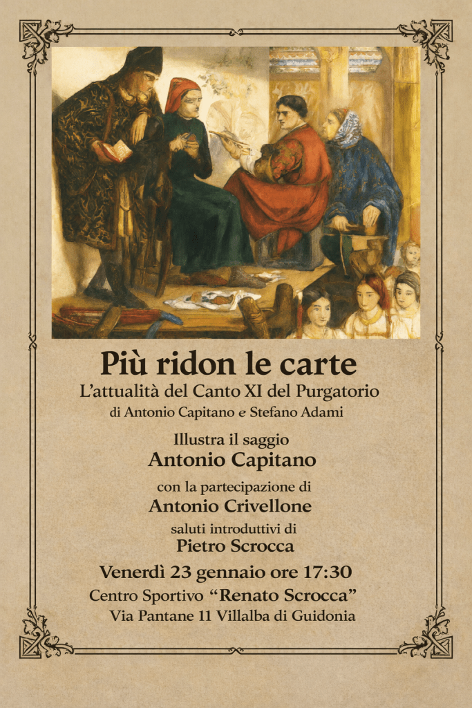 Portare Dante in spazi poco frequentati dagli incontri letterari è l’obiettivo della presentazione del saggio “Più ridon le carte – L’attualità del Canto XI del Purgatorio”, firmato da Antonio Capitano e Stefano Adami. L’iniziativa nasce dalla volontà di far dialogare la poesia dantesca con contesti quotidiani e territoriali, avvicinando il pensiero medievale alla sensibilità contemporanea attraverso metafore ancora riconoscibili e attuali.