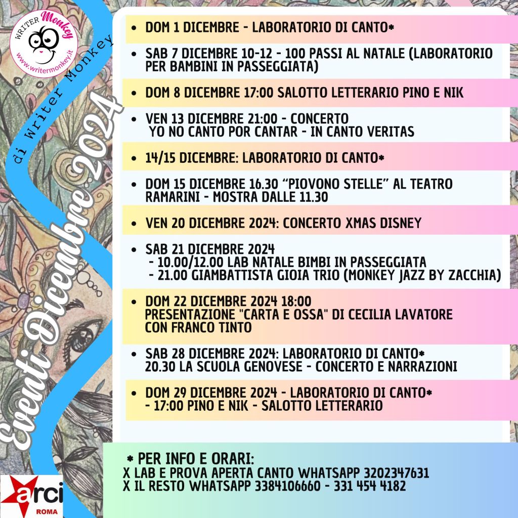 Che siate amanti della musica, della letteratura o desideriate trascorrere del tempo in famiglia, il Circolo Arci Writer Monkey e le sue collaborazioni sul territorio vi aspettano per un dicembre indimenticabile, tra arte, cultura e condivisione.