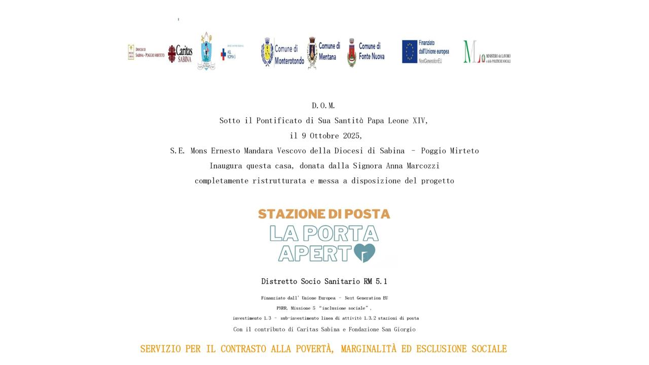 Nel cuore del Distretto socio-sanitario RM 5.1, che comprende Monterotondo, Mentana e Fonte Nuova, nasce un presidio concreto contro la marginalità: “La Porta Aperta”, la nuova Stazione di Posta realizzata dalla Diocesi Sabina in collaborazione con la Fondazione San Giorgio di Roma.