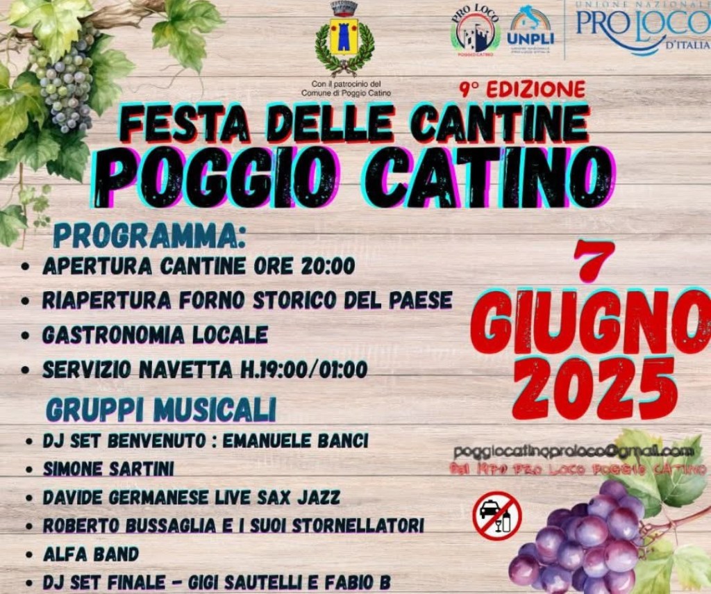 Sabato 7 giugno 2025, il borgo di Poggio Catino torna a riempirsi di sapori, musica e convivialità in occasione della IX edizione della Festa delle Cantine, organizzata dalla Pro Loco di Poggio Catino con il patrocinio del Comune.