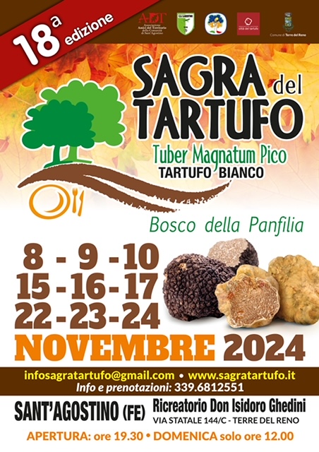 Dall’8 al 24 novembre, nei weekend (8-9-10, 15-16-17, 22-23-24), tutte le sere dalle 19:30 e la domenica a pranzo dalle 12:00, torna l’atteso appuntamento con il tartufo di Sant’Agostino. Piatti come lasagne, tortellini, crespelle, sformati e specialità come la faraona in crosta di pane e la cotoletta saranno protagonisti, preparati con cura per soddisfare le migliaia di visitatori attesi. Il tutto sarà arricchito dal tartufo bianco “Magnatum Pico”, il pregiato tubero di novembre.