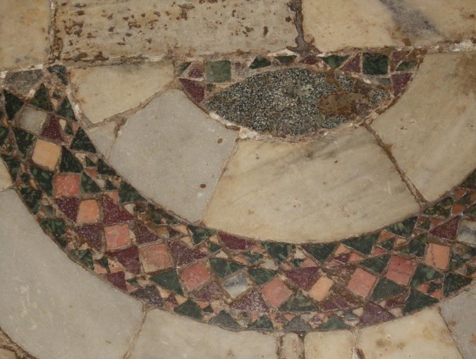 triangoli. Tessere di serpentino, porfido e vari altri marmi in sostituzione del giallo antico andato perduto. La losanga al centro della ruota è l’indizio più forte che può farci attribuire con una certa sicurezza il lavoro pavimentale alla bottega cosmatesca di Iacopo di Lorenzo o di Cosma.