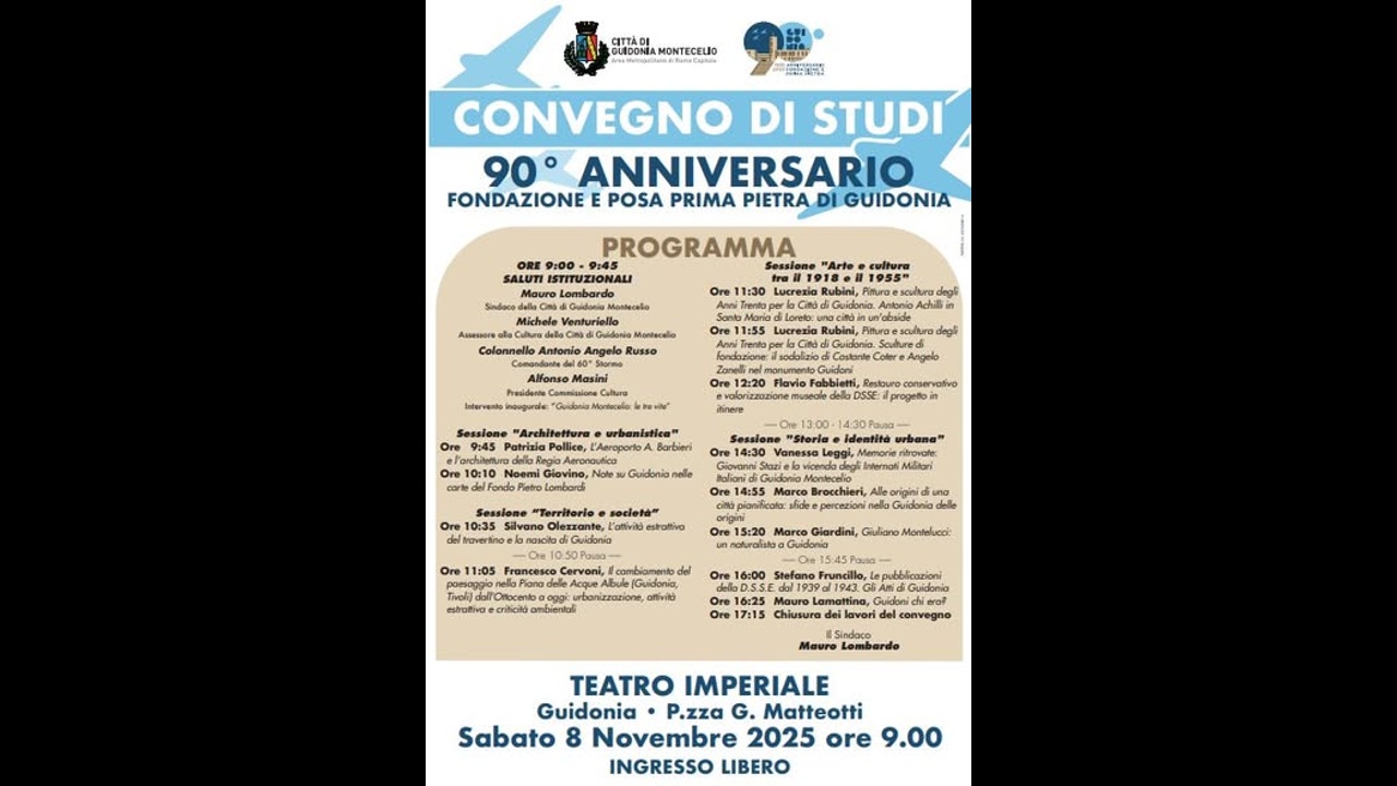 In occasione del 90° anniversario della fondazione e della posa della prima pietra di Guidonia, la città si prepara a celebrare la ricorrenza con un convegno di studi in programma sabato 8 novembre 2025, a partire dalle ore 9:00, presso il Teatro Imperiale in Piazza Matteotti.