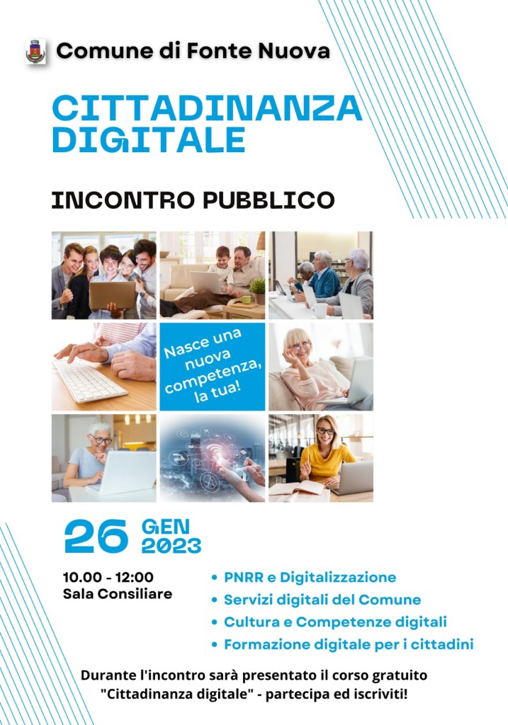 Giovedì 26 Gennaio alle ore 10.00, presso la Sala Consiliare del Comune di Fonte Nuova, si terrà un incontro pubblico sulla cittadinanza digitale.