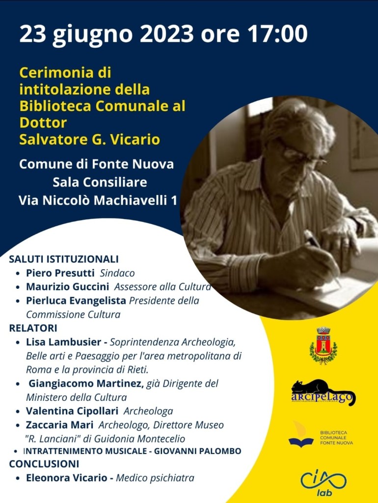Il Prefetto della Provincia di Roma, preso atto della Deliberazione n. 62 adottata dalla Giunta Comunale di Fonte Nuova in data 10 maggio 2022, ha riconosciuto con favore la decisione di intitolare la nuova biblioteca al profondo conoscitore e studioso locale, Salvatore Giuseppe Vicario. Quest’ultimo, scomparso nel 2019, ha dedicato le proprie abilità tecniche e intellettuali al servizio dei cittadini e del Comune di Fonte Nuova, apportando un contributo fondamentale alla comprensione del territorio nomentano e delle aree circostanti.