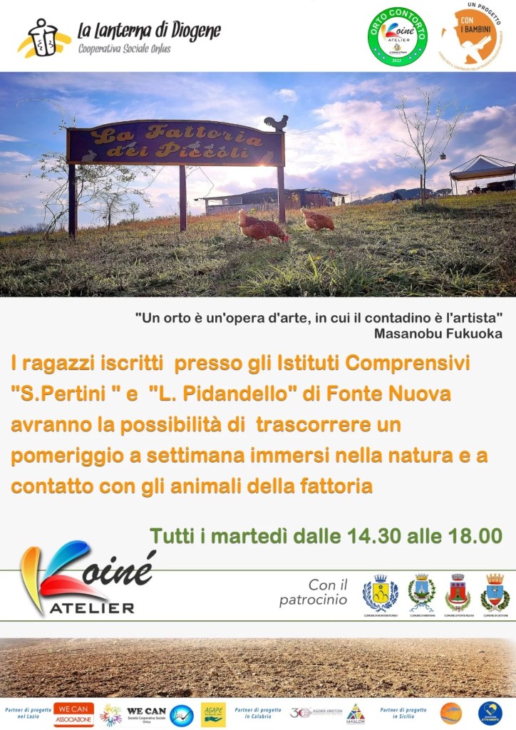 Come afferma Masanobu Fukuoka, un orto è un’opera d’arte in cui il contadino è l’artista. Questo concetto è al centro del progetto “L’Atelier Koinè”, selezionato e promosso dall’impresa sociale “Con i Bambini”, di cui la Lanterna di Diogene è ente capofila. Il laboratorio Orto Contorto, rivolto ai ragazzi dell’Istituto Pirandello e dell’Istituto Pertini di Fonte Nuova, nasce con l’intento di educare i giovani alla pratica dell’agricoltura sostenibile e promuovere l’importanza del rispetto per l’ambiente.