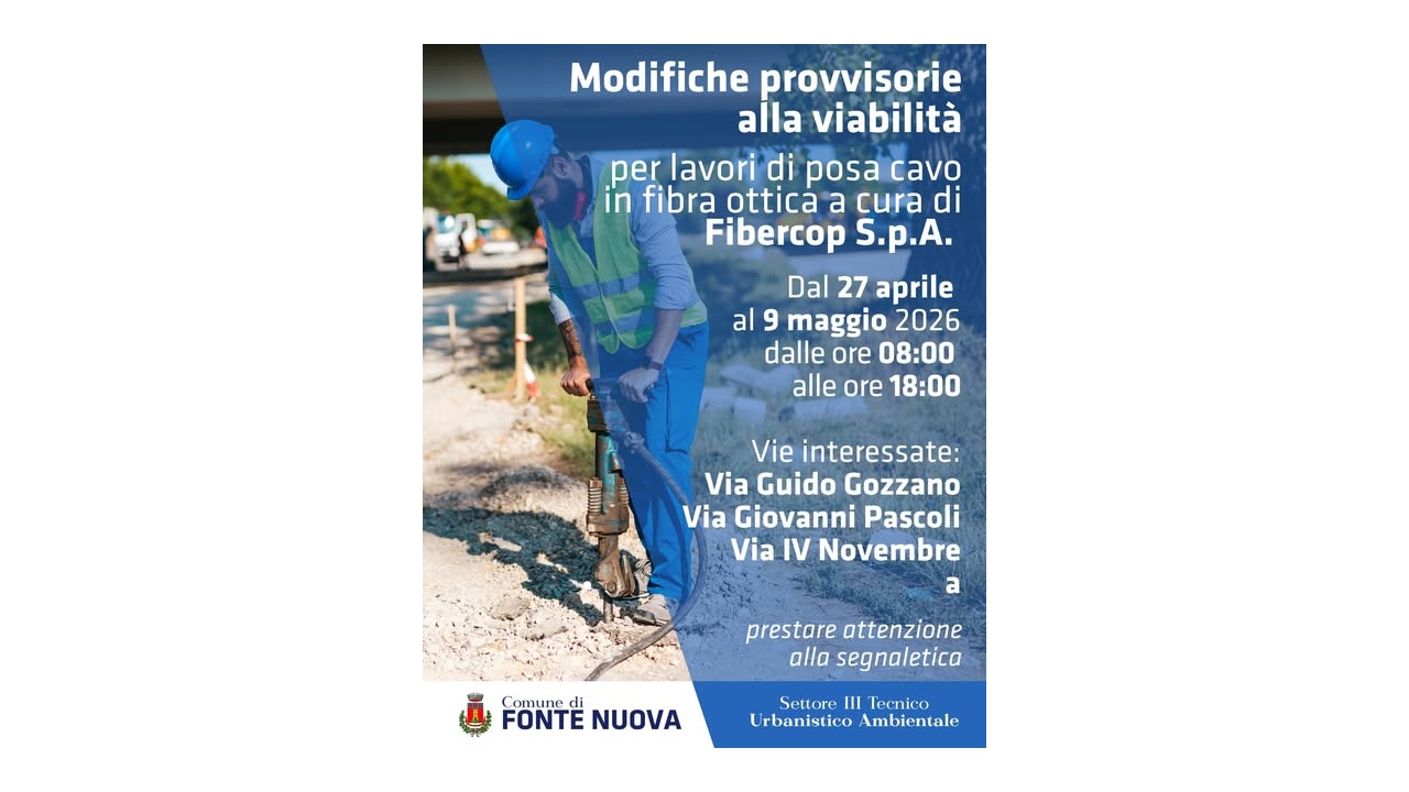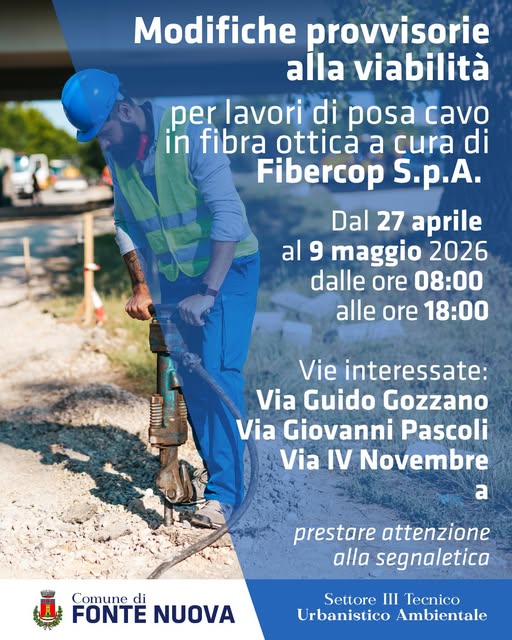 Il Comune di Fonte Nuova informa la cittadinanza che, a partire dal 27 aprile e fino al 9 maggio 2026, saranno in vigore modifiche temporanee alla viabilità per consentire i lavori di posa della fibra ottica a cura di Fibercop S.p.A.