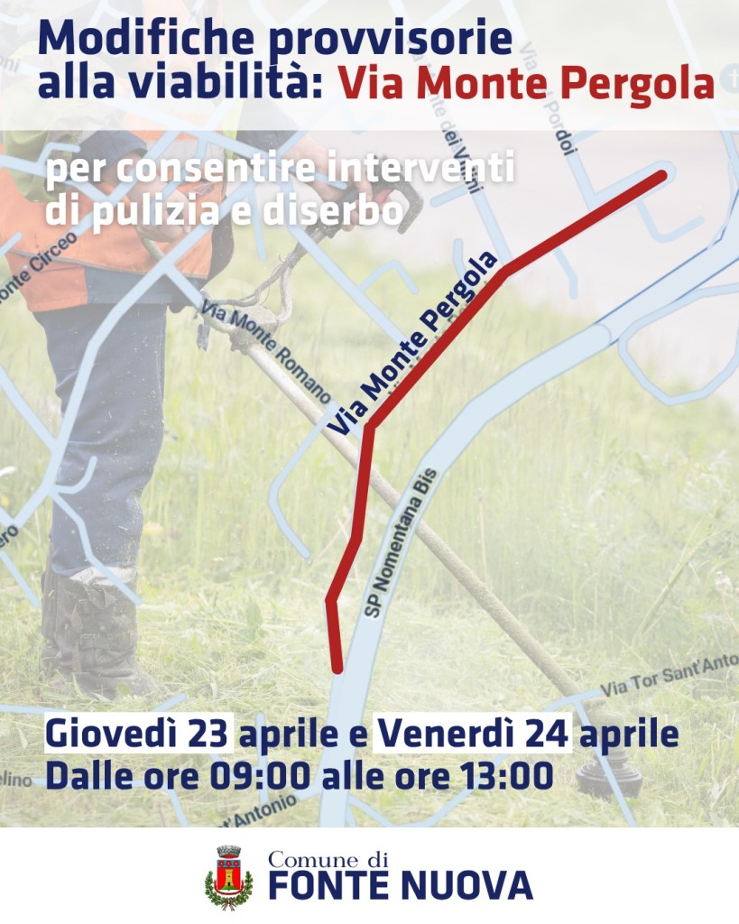 Il Comune di Fonte Nuova ha comunicato una modifica provvisoria della viabilità in via Monte Pergola, necessaria per consentire interventi di pulizia e diserbo.