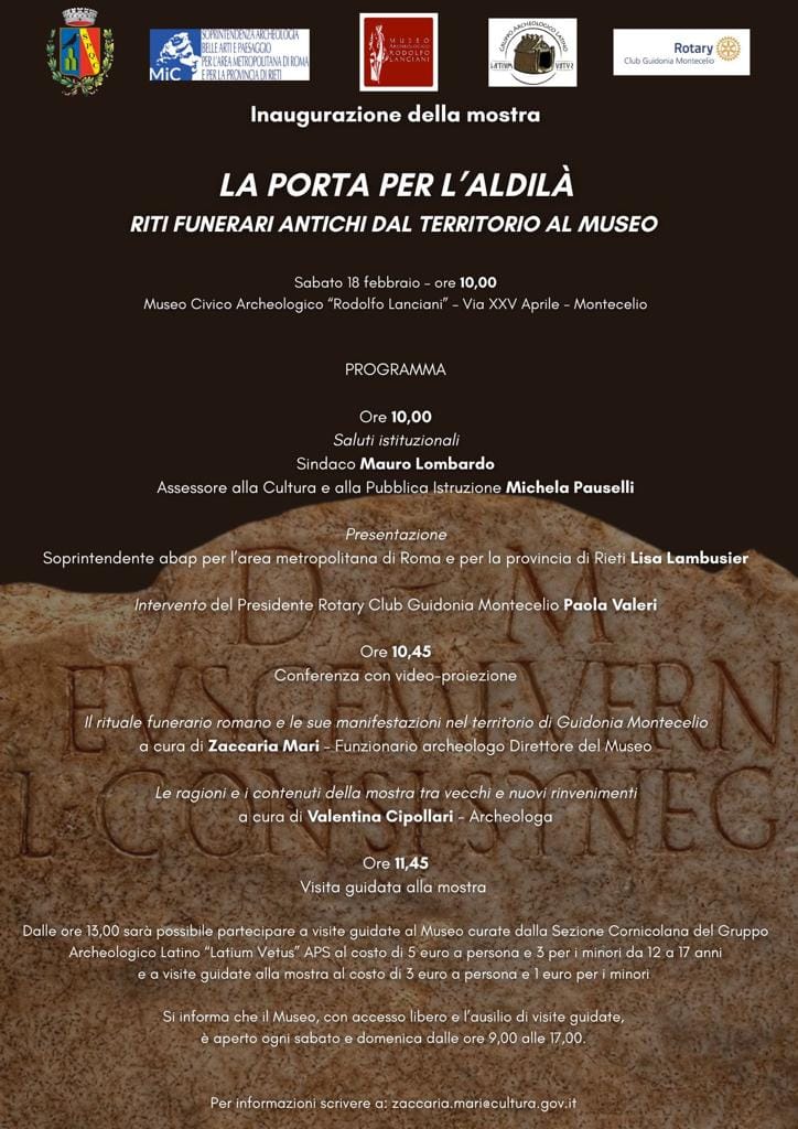 Sabato 18 Febbraio, alle ore 10.00, presso il Museo Rodolfo Lanciani di Guidonia Montecelio, ci sarà una speciale conferenza che aprirà la mostra sui riti funerari antichi del territorio “La porta per l’aldilà”.
