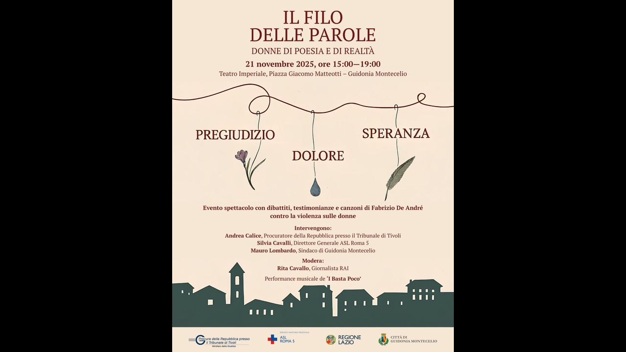 In occasione della Giornata internazionale per l’eliminazione della violenza contro le donne 2025, il Teatro Imperiale di Guidonia Montecelio ospiterà, venerdì 21 novembre dalle ore 15:00, l’incontro dal titolo “Il Filo delle Parole – Donne di poesia e di realtà”.