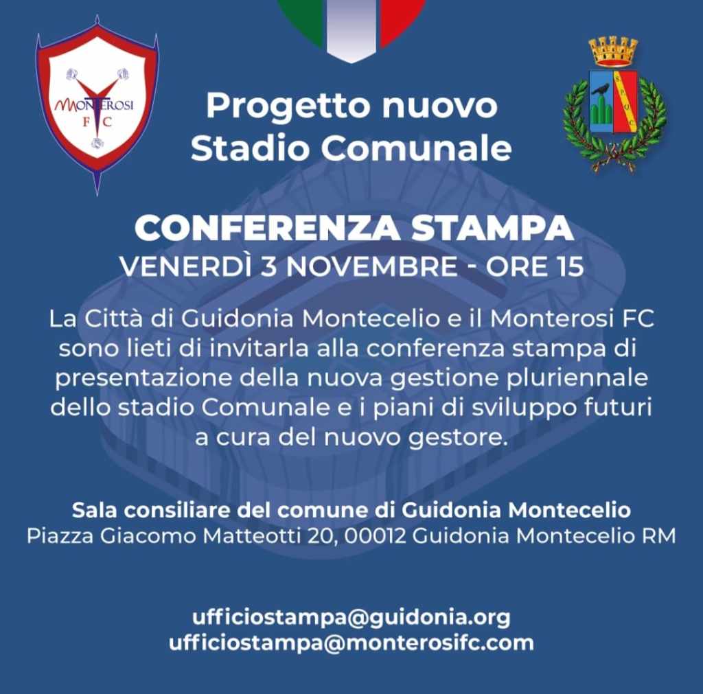 La Città di Guidonia Montecelio e il Monterosi F.C. sono lieti di invitare tutti alla conferenza stampa di presentazione della nuova gestione pluriennale dello Stadio Comunale e i piani di sviluppo futuri a cura del nuovo Gestore.