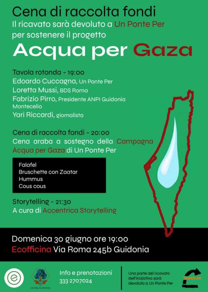 Domenica 30 giugno, Oltre Il Ponte APS ed Ecofficina si uniscono per sostenere la campagna “Acqua per Gaza” di Un Ponte Per ETS, a Guidonia. A partire dalle ore 19:00, l’evento prevede una tavola rotonda, una cena araba e uno storytelling a cura di Accentrica Storytelling.