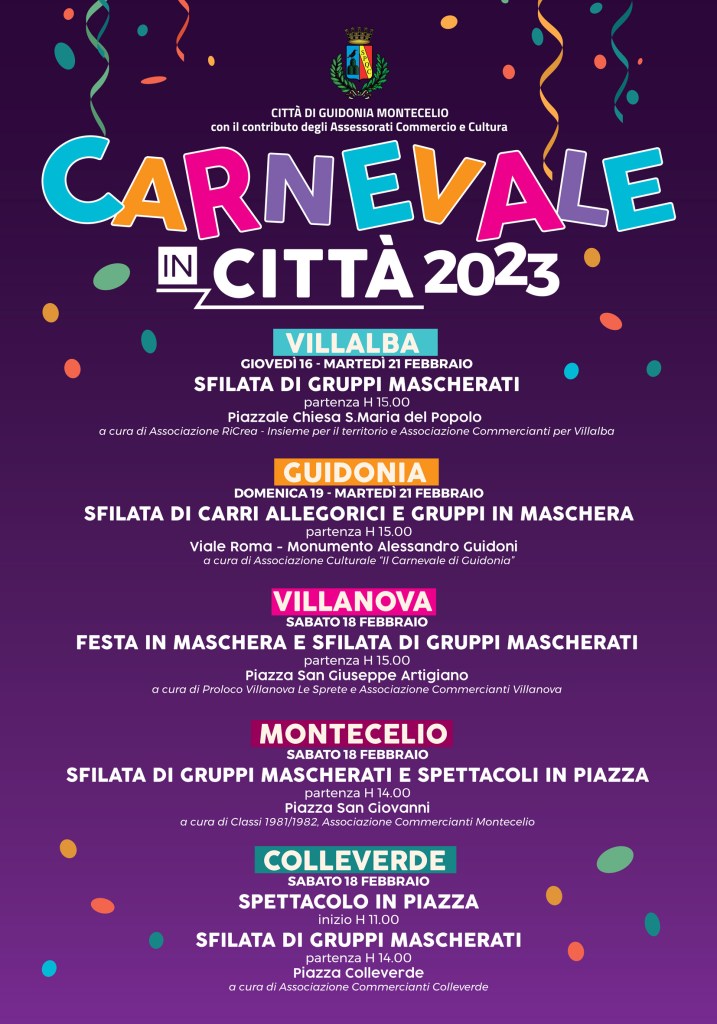 Torna il Carnevale nelle vie della Città di Guidonia. La festa, che prenderà il via giovedì 16 e proseguirà fino a martedì 21, coinvolgerà diverse circoscrizioni. Grazie all’operato di tante associazioni, al contributo organizzativo ed economico degli Assessorati al Commercio e alla Cultura, quest’anno il Carnevale coinvolgerà oltre Guidonia anche: Villalba, Villanova, Montecelio e Colleverde