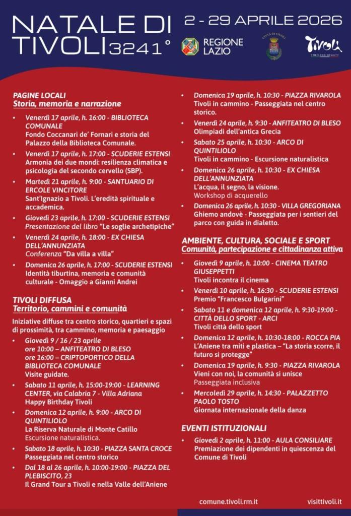 La città di Tivoli si prepara a celebrare il 3241° Natale di Tivoli con un ricco calendario di appuntamenti che animeranno il territorio per tutto il mese di aprile.