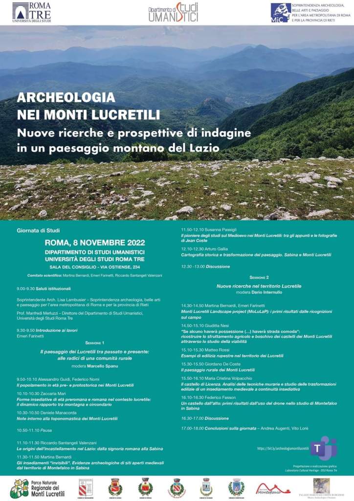 Martedì 8 novembre 2022 è prevista all’Università degli Studi Roma Tre una Giornata di Studi organizzata dal Dipartimento di Studi Umanistici sul tema “Archeologia dei Monti Lucretili. Nuove ricerche e prospettive di indagine in un paesaggio montano del Lazio”.