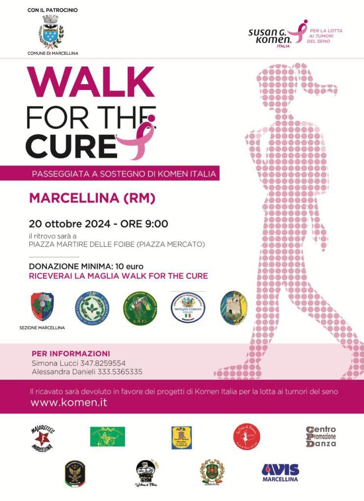 L’Amministrazione comunale di Marcellina parteciperà all’edizione 2024 della “Walk for the Cure,” la celebre manifestazione organizzata dall’Associazione Susan G. Komen per sostenere la lotta contro i tumori del seno. L’evento, in programma per domenica 20 ottobre, coinvolgerà cittadini e volontari in una passeggiata solidale per sensibilizzare sull’importanza della prevenzione e raccogliere fondi a favore dei progetti promossi da Komen Italia.