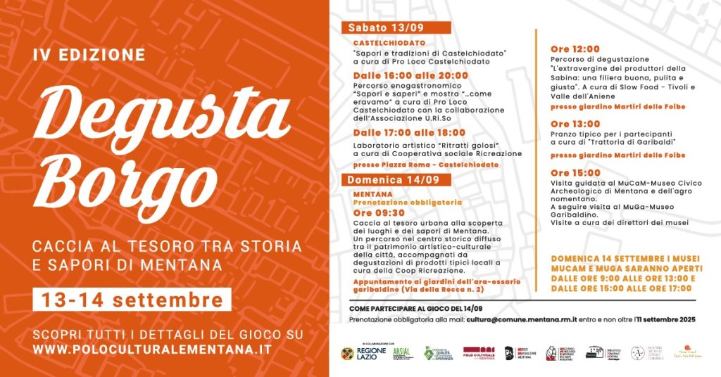 Il Polo Culturale di Mentana annuncia la quarta edizione di Degustaborgo, l’appuntamento che unisce enogastronomia, storia e cultura. L’evento, finanziato da ARSIAL, si terrà il 13 e 14 settembre 2025 e proporrà due giornate dedicate alla scoperta del territorio e delle sue tradizioni.