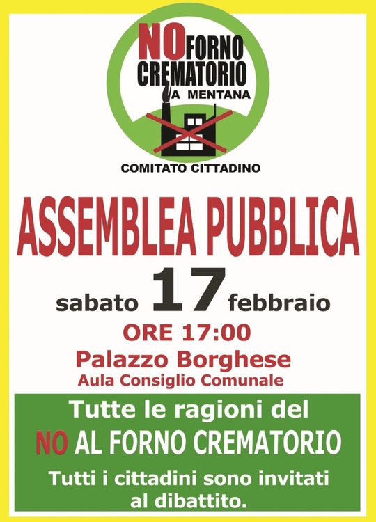 “L’assemblea cittadina convocata dal “Comitato NO forno crematorio a Mentana” ha visto, nella serata di ieri 17 febbraio, la partecipazione di centinaia di cittadini, riempiendo sia la sala consiliare di Palazzo Borghese che il piazzale antistante. Tutti i presenti hanno seguito con attenzione quanto esposto sia dal Dott. Bartolino e dell’Arch. Maggioli, componenti del Direttivo del suddetto Comitato, che dal Dott. Umberto Calamita, membro del CRA (Comitato di Risanamento Ambientale) area Nord-Est Roma che ha rappresentato la pericolosità delle emissioni di impianti di incenerimento, nonostante la presenza di filtri che, dovendo essere cambiati frequentemente e avendo un costo elevato, potrebbero indurre la società appaltante a non sostituirli con la giusta frequenza cercando di lucrare il più possibile, trattandosi di una azienda privata che deve fare profitto.