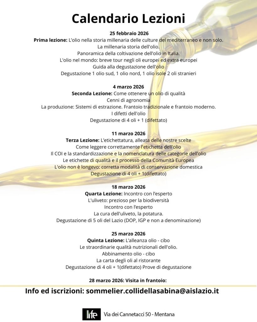 Il 18 marzo 2026 è previsto un incontro con l’esperto, con focus sull’uliveto, la biodiversità e la cura delle piante, accompagnato da degustazioni di oli del Lazio. La quinta lezione, il 25 marzo 2026, sarà dedicata all’alleanza tra olio e cibo, alle qualità nutrizionali e alla carta degli oli al ristorante. Il percorso si concluderà con una visita in frantoio sabato 28 marzo 2026.