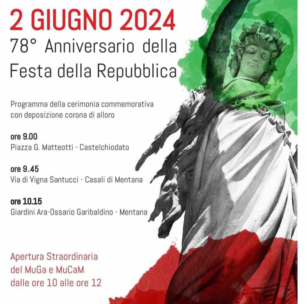 Il 2 giugno 2024 si celebra il 78° Anniversario della Festa della Repubblica Italiana. La giornata sarà caratterizzata da una serie di cerimonie commemorative che, a Mentana, includeranno la deposizione di corone di alloro in diverse località. Il programma delle cerimonie è il seguente: