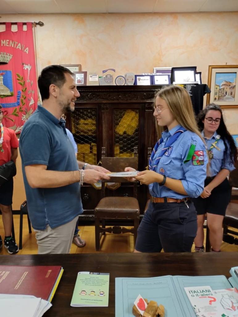 Oggi, in un gesto di riconoscimento e sostegno, il Sindaco Marco Benedetti ha voluto incontrare Giulia, membro del gruppo scout di Mentana. Durante questo speciale incontro, il Sindaco ha consegnato alla giovane scout un gagliardetto appositamente ideato per l’occasione. Il gagliardetto è un simbolo carico di significato, poiché rappresenta non solo la città di Mentana, ma anche il 25º Jamboree mondiale degli scout e il logo federale della FIS, ovvero la Federazione Italiana dello Scoutismo.
