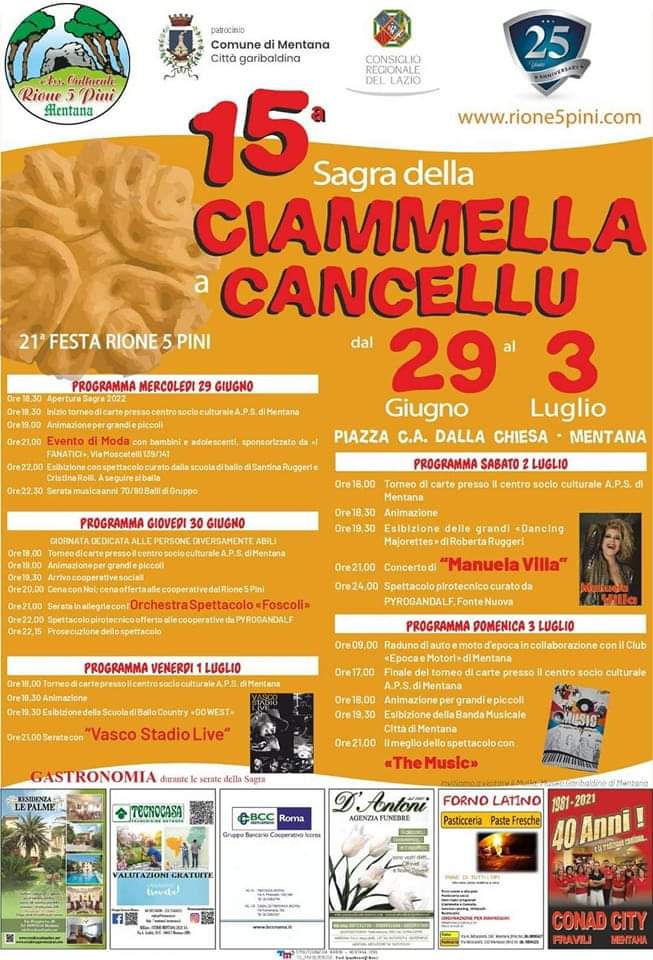 A Mentana, in provincia di Roma, si attendono numerosi eventi per la 15a edizione della Sagra a Cancello, organizzata da Rione Cinque Pini, patrocinata dal Comune di Mentana.