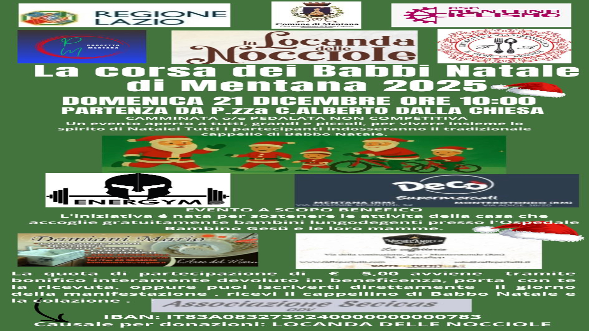 A Mentana viene presentata la prima edizione della “Corsa dei Babbi Natale 2025”, un’iniziativa benefica pensata per raccogliere fondi a sostegno delle attività della Locanda delle Nocciole, struttura che accoglie gratuitamente bambini lungodegenti dell’Ospedale Bambino Gesù e le loro mamme. L’evento si terrà il 21 dicembre 2025 alle ore 10:00 in piazza Carlo Alberto dalla Chiesa.