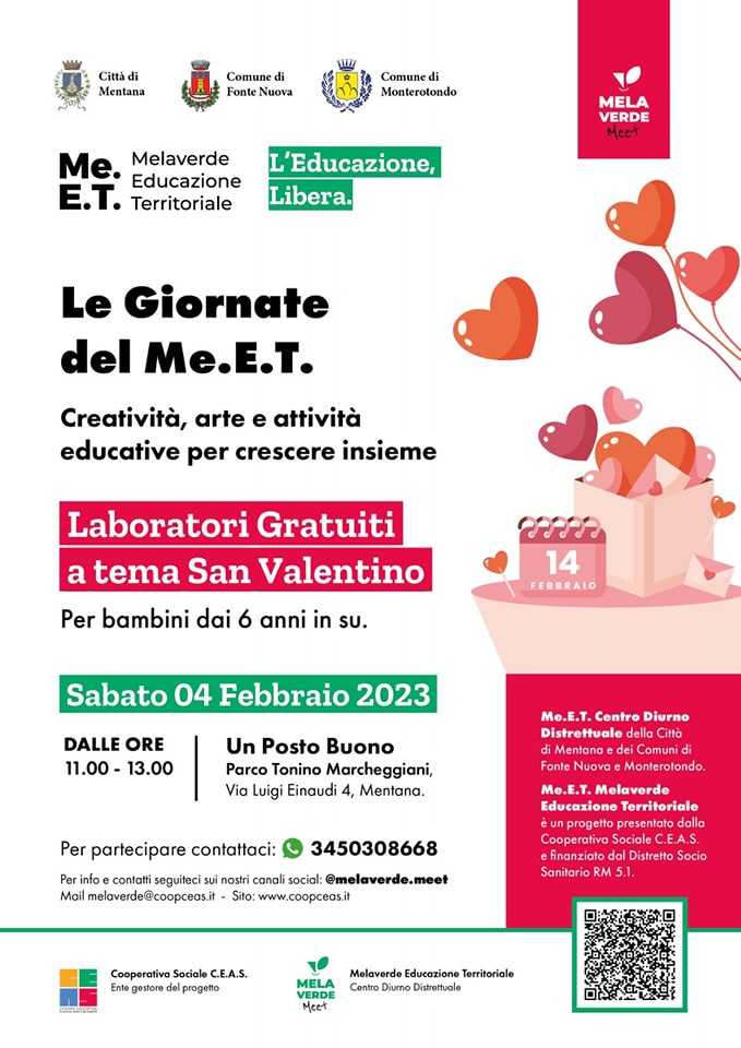 Sabato 4 Febbraio dalle ore 11.00 alle ore 13.00, a Mentana, presso il Parco Tonino Marcheggiani, in Via Luigi Einaudi 4, ci saranno dei laboratori artistici per i più piccoli in tema San Valentino.