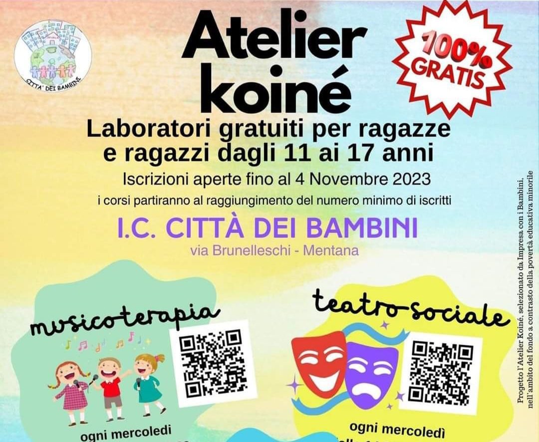 L’Atelier Koinè offre un’iniziativa dedicata all’educazione e allo sviluppo creativo dei giovani, un’opportunità straordinaria per ragazzi di età compresa tra gli 11 e i 17 anni. Fino a sabato 4 novembre, è possibile iscriversi ai corsi gratuiti che si terranno presso l’Istituto comprensivo “Città dei bambini” di Mentana.