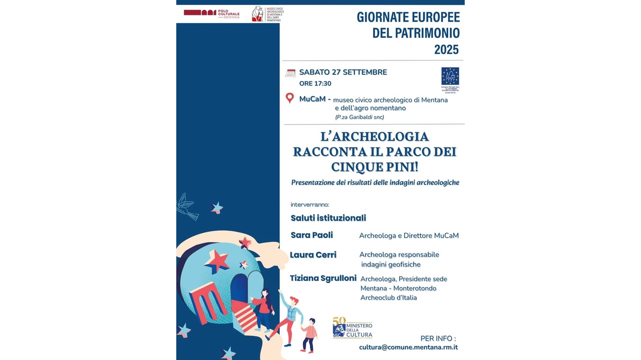 Nell’ambito delle Giornate Europee del Patrimonio 2025, sabato 27 settembre alle ore 17:30 al MuCaM – Museo Civico Archeologico di Mentana e dell’Agro Nomentano si terrà la presentazione dei risultati delle recenti indagini archeologiche condotte nel Parco dei Cinque Pini.