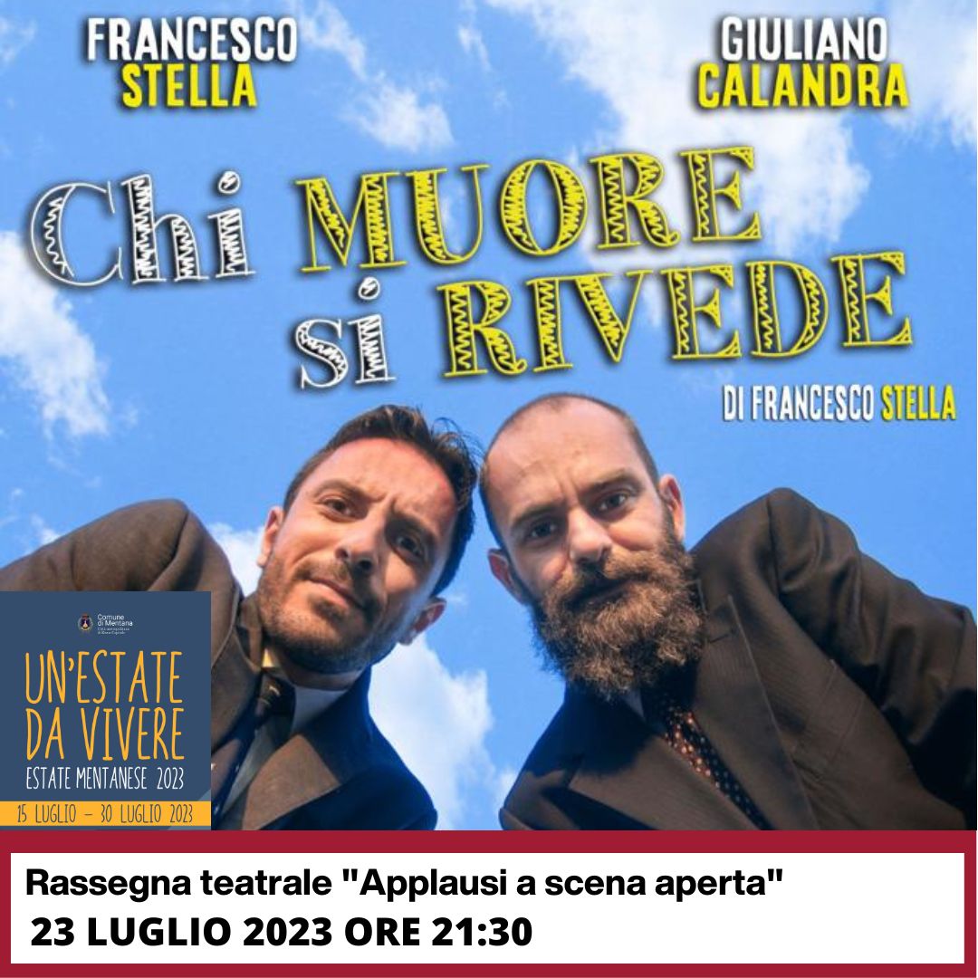 Domenica 23 Luglio, alle ore 21.30, a Mentana, ai giardini dell’ara ossario garibaldina, gli spettatori saranno trasportati in un’esperienza teatrale unica con lo spettacolo “Chi muore si rivede” di Francesco Stella, interpretato da Francesco Stella e Giuliano Calandra, e diretto da Nicola Pistoia.