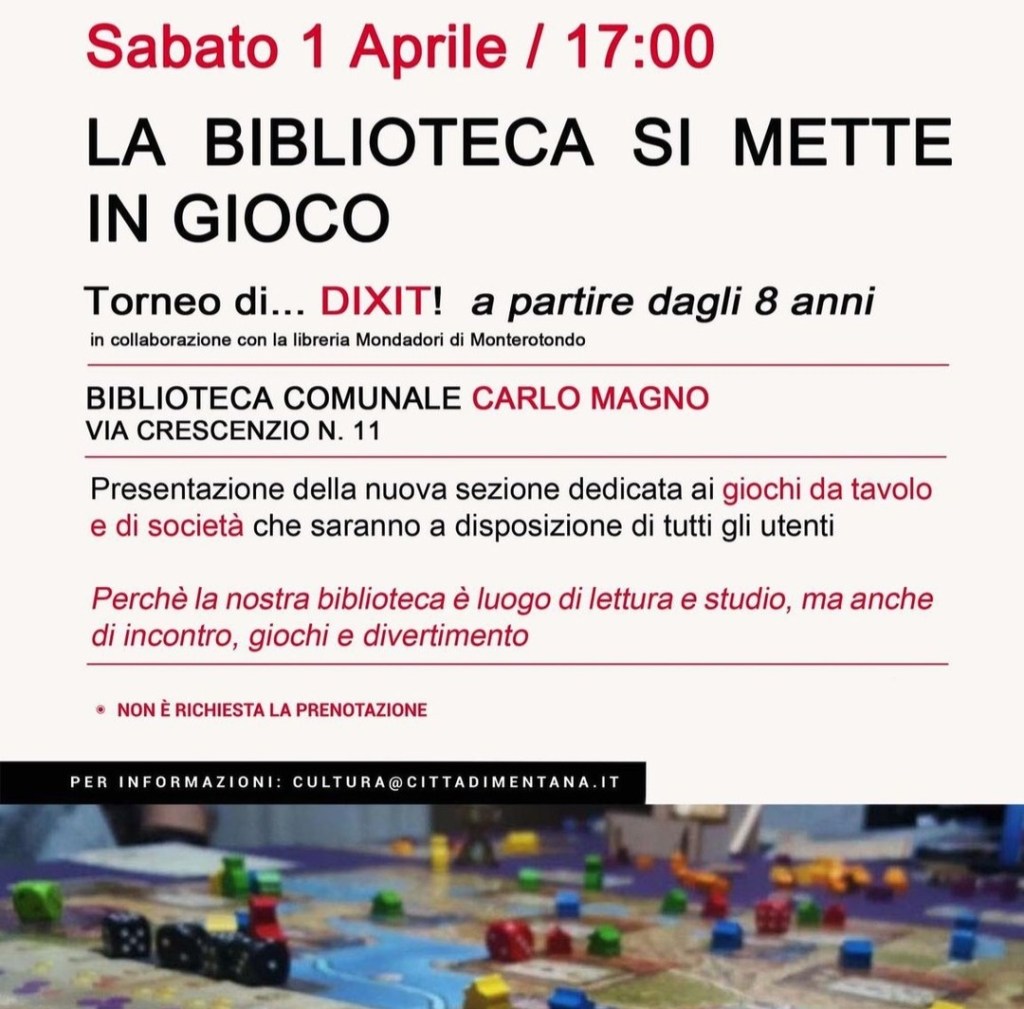 Ma non è tutto: durante l’evento verrà inaugurata anche la nuova sezione della Biblioteca dedicata ai giochi da tavolo e di società, che saranno a disposizione di tutti gli utenti, per scoprire nuovi titoli e divertirsi insieme ad altri giocatori.
