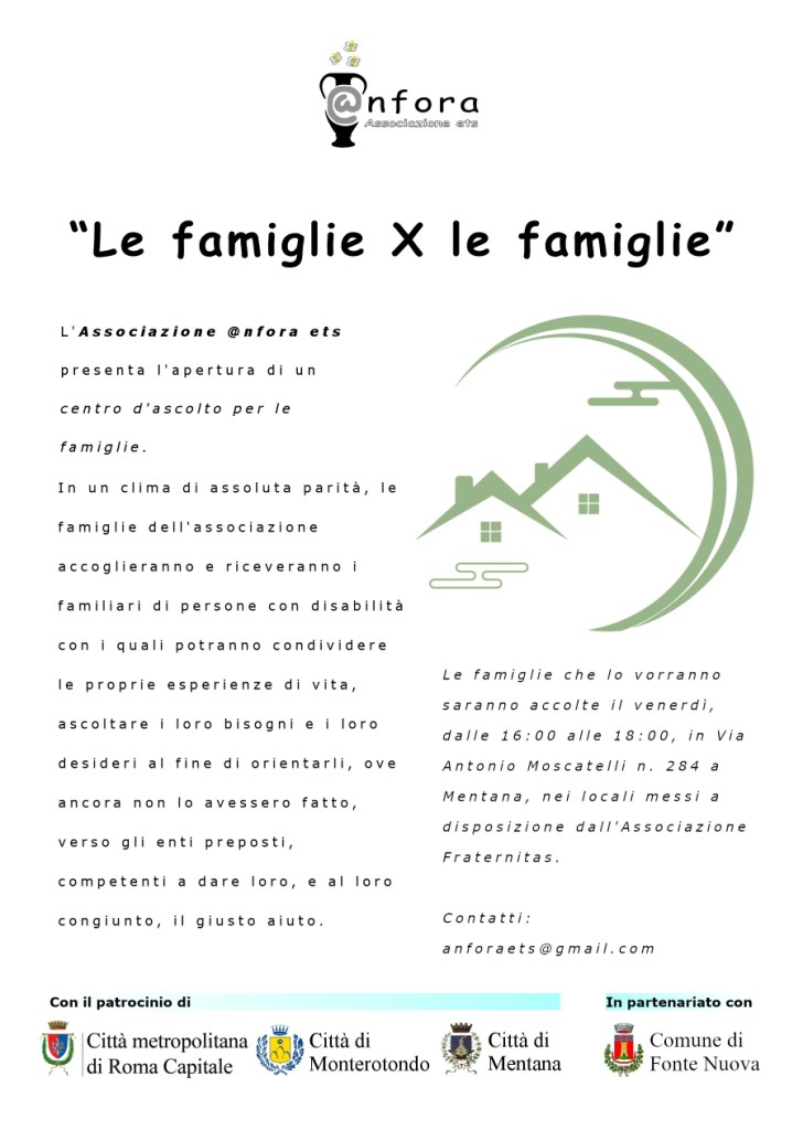 Venerdì 3 Marzo alle ore 16.00, a Mentana, in Via Antonio Moscatelli 284, nasce un nuovo centro di ascolto, per dare voce ai cittadini con disabilità, grazie all’Associazione @nfora ets, che accoglierà le famiglie che necessitano di un sostegno in merito, per condividere le esperienze, ed ascoltare i bisogni.