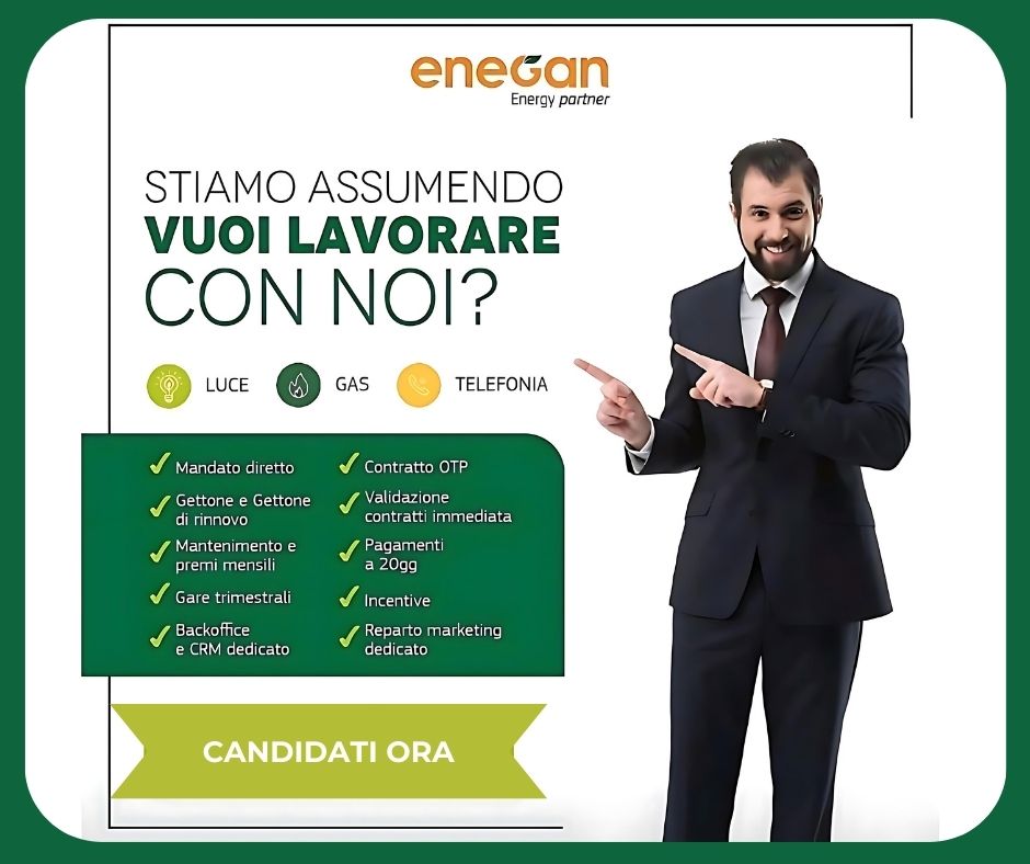 La figura ricercata è quella di Consulente Commerciale, da inserire, previa formazione, nella struttura con un mandato diretto con la società Enegan. Il tutto anche senza avere esperienza nel settore.