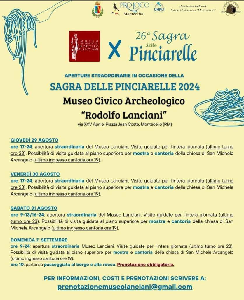 Il Museo Civico Archeologico “Rodolfo Lanciani” di Montecelio, in via XXV Aprile, Piazza Jean Coste, annuncia un programma speciale di aperture in occasione della 26ª Sagra delle Pinciarelle.