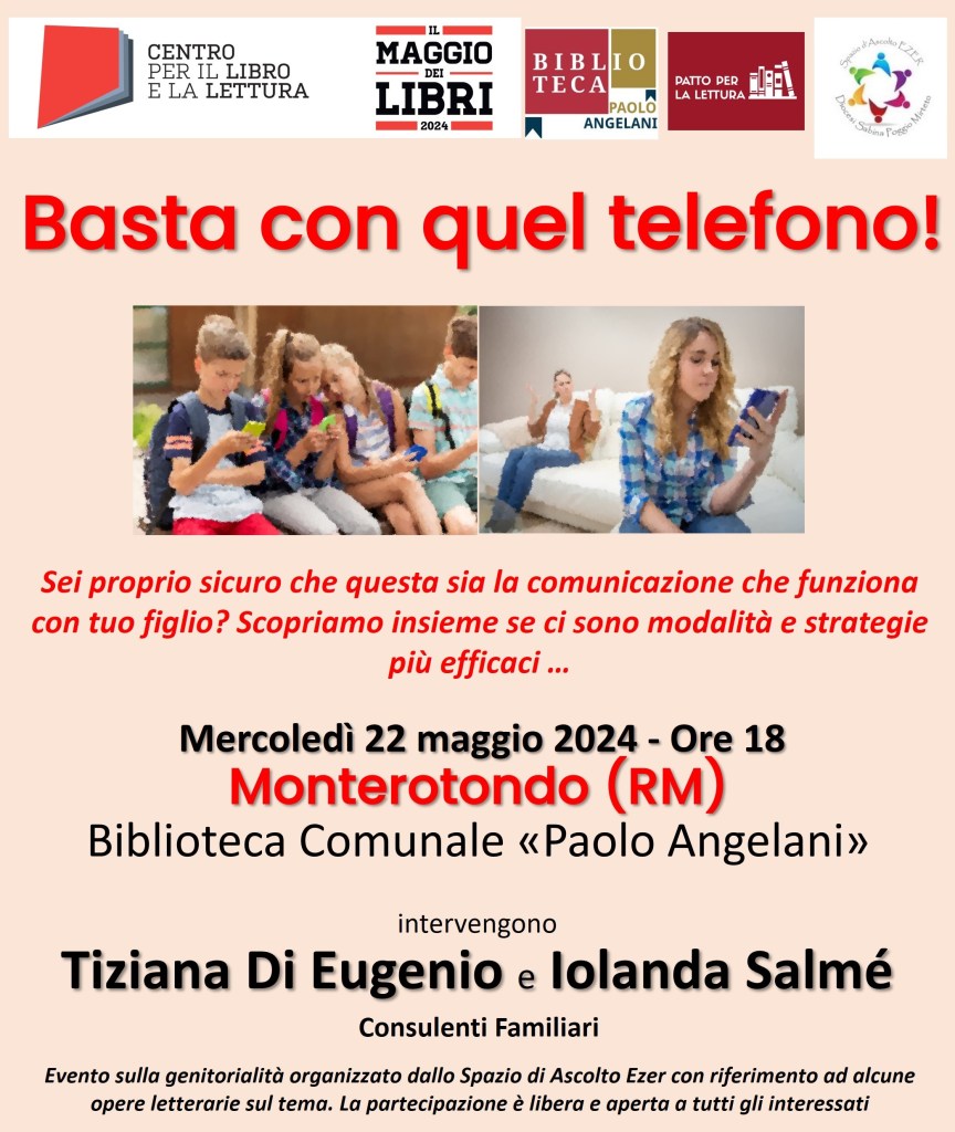Mercoledì 22 maggio alle ore 18 presso la Biblioteca Angelani del Comune di Monterotondo lo Spazio Ezer – Centro di ascolto di Monterotondo Scalo ha organizzato un evento gratuito indirizzato ai genitori, i nonni, gli educatori e a tutti coloro che hanno a che fare con i bambini e i ragazzi.