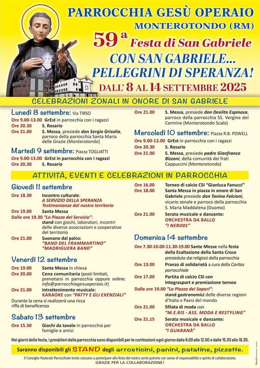 Dall’8 al 14 settembre 2025 la Parrocchia Gesù Operaio di Monterotondo ospiterà la 59ª Festa di San Gabriele, appuntamento religioso e comunitario molto sentito in città.